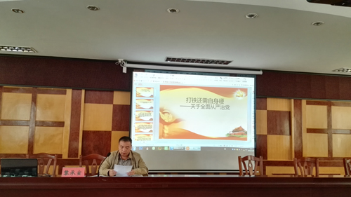 在党课上,全体人员首先观看了反腐纪录片《永远在路上》,该片以典型案例展示,具有很强的警示和教育意义。随后,局党委委员黄开明、黎承宣、陈祖荣、黄镜名分别就通过学习习总书记的"绿水青山就是金山银山" 、"打铁还需自身硬" 、 "让老百姓过上好日子"、"以新发展理念引领发展"等系列讲话精神,联系实际工作作了专题发言。